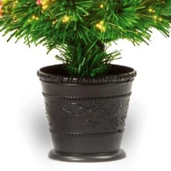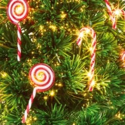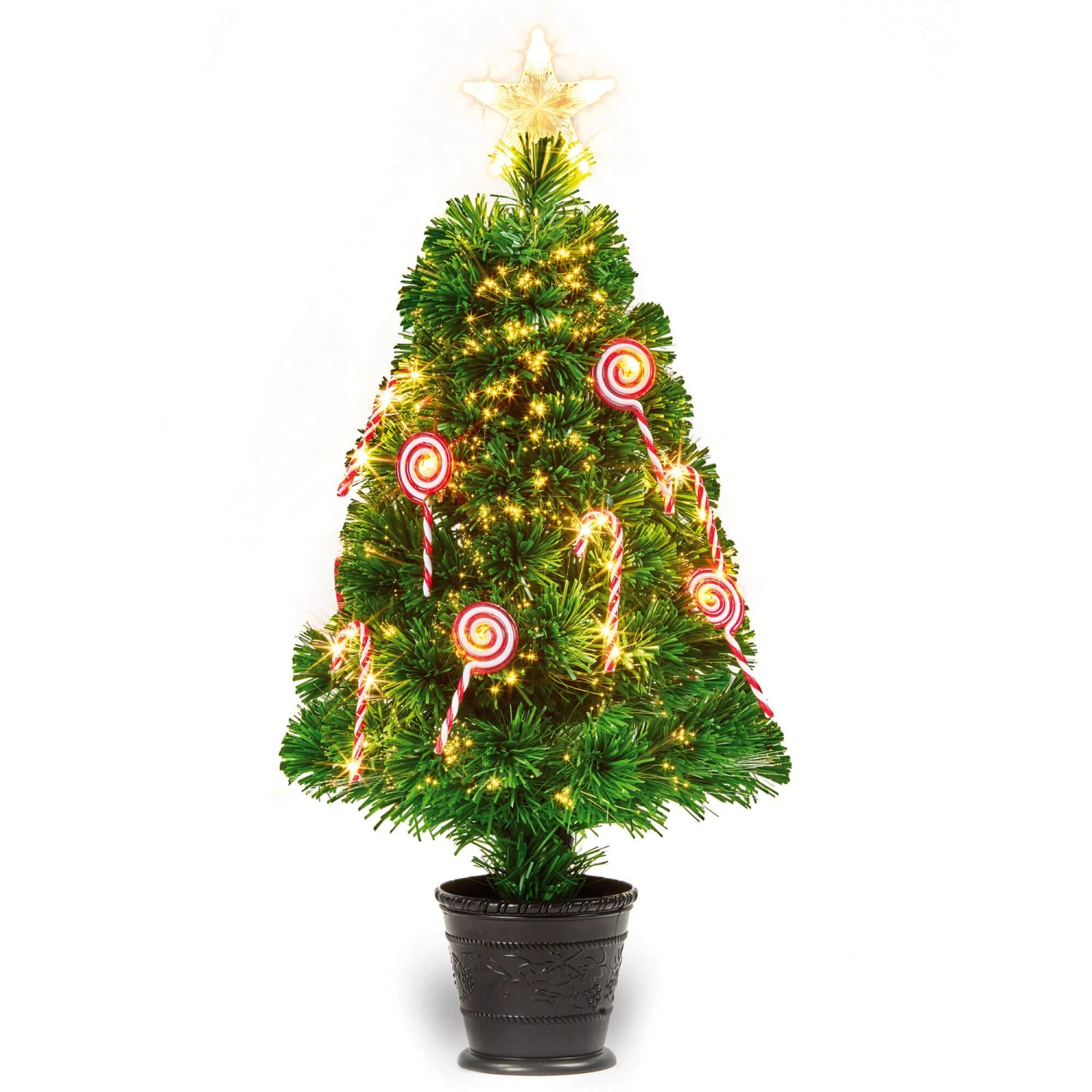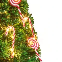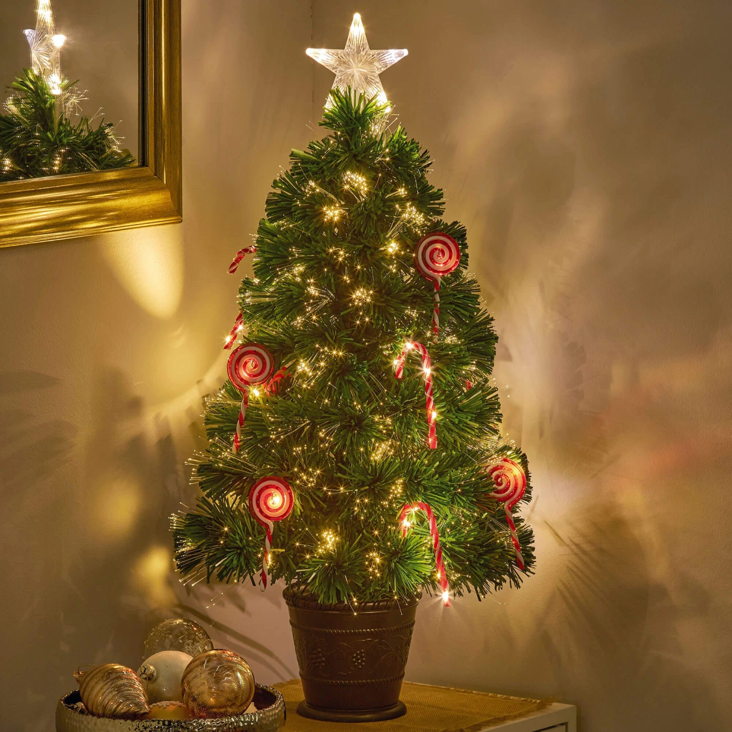 This 2.5ft Fibre Optic Candy Cane Christmas tree is perfect for a side table or shelf. The tree is fibre optic so you don’t need to add any lights to it. The addition of the candy canes and lollypops adds some colour to the tree so there is no need to add baubles to it. The tree is in a pattered pot giving the impression that it is a real tree that has been planted and decorated. There is also a bright shining star on the top of the tree to complete the look.