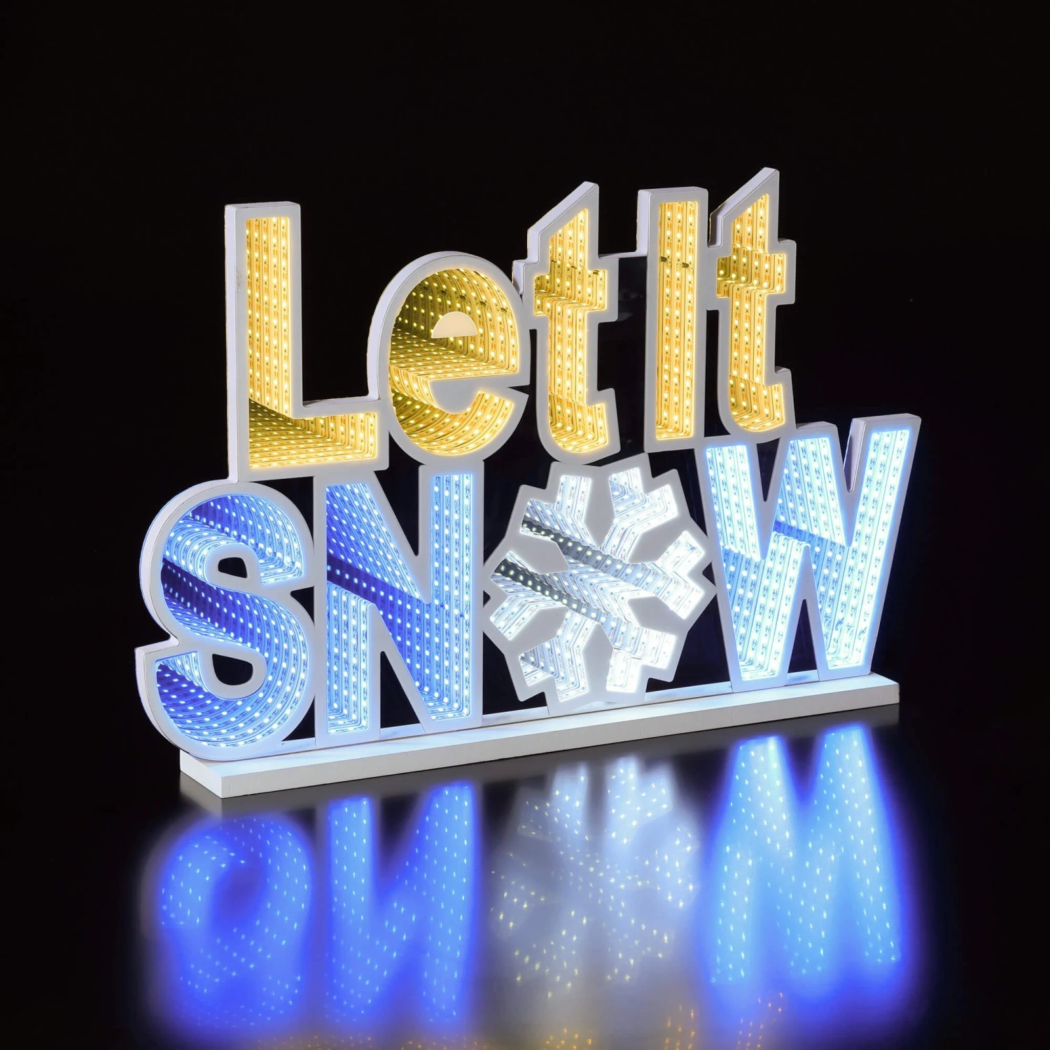 Bring some festive cheer to your home with this Infinity “Let It Snow” light, a modern decoration standing 32cm tall. This cheerful sign illuminates with a static, constant glow, conveniently powered via USB. The words “Let it” glow a cosy warm white, while “snow” is a vibrant blue, with the ‘o’ specifically featuring a bright white snowflake shape, making this a standout feature in your Christmas décor.