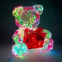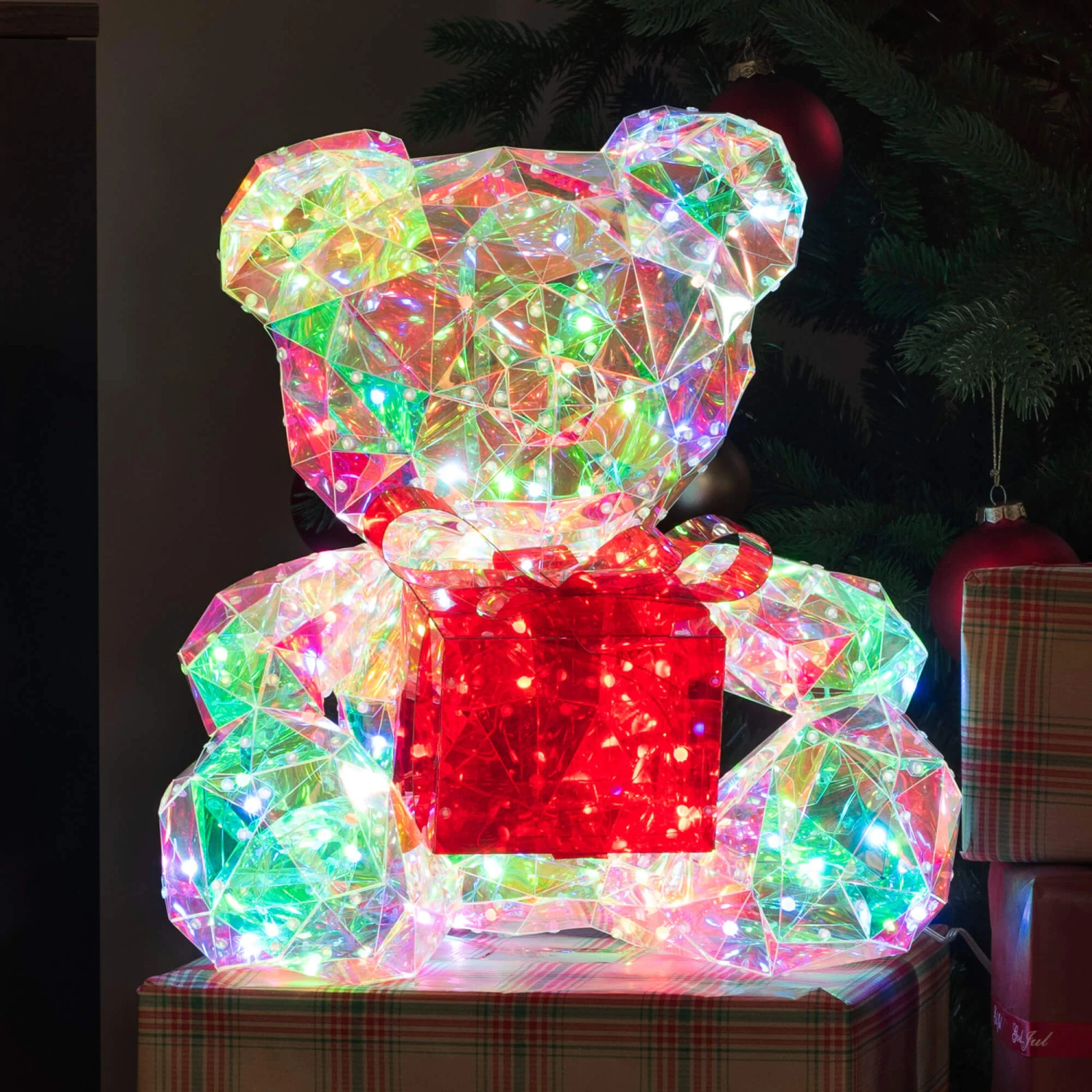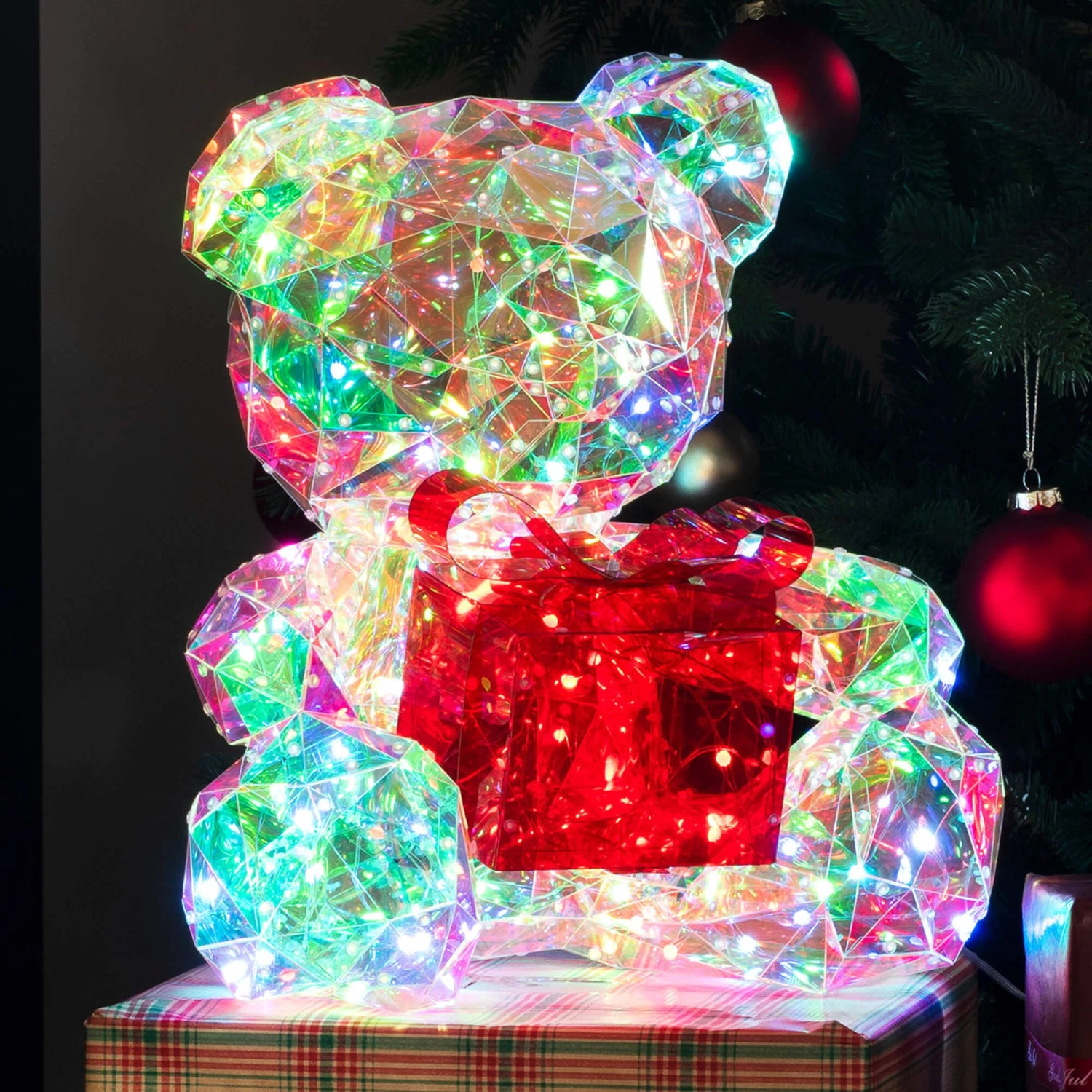This striking plug-in LED Iridescent Bear is defined by its unique geometric design, a modern interpretation of a classic teddy bear. The clear body of the bear is constructed from numerous faceted panels that give it a captivating, crystal-like appearance.