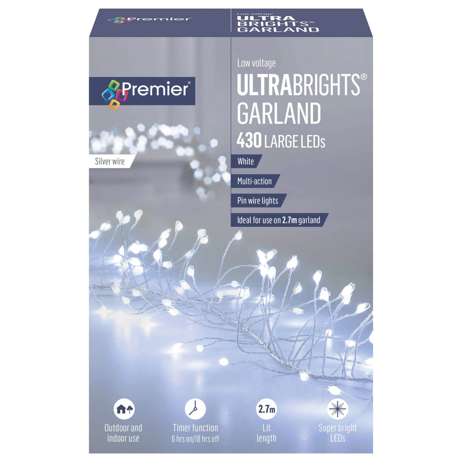 Ideal for use on a 2.7 metre garland, this dazzling set of 430 multi action Ultrabrights LED Christmas garland lights will illuminate your space with a white effect, whilst the timer function and multi action controller means you can light up your home in whichever way you like this festive season. Suitable for indoor and outdoor use, there are many ways in which you can use the lights to create a festive, winter wonderland in your home or garden.