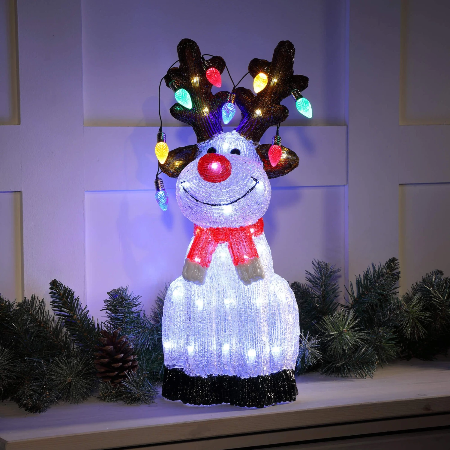 Inject a little enchantment and sparkle into your festive décor with this magnificent 54cm LED Acrylic Reindeer with String Lights. This truly unique piece is a joyous addition to any home, promising to be a talking point throughout the holiday season. Expertly crafted from durable, high quality acrylic, this reindeer boasts a stunning, textured finish that gives its body a brilliant, icy glow when illuminated. The attention to detail is superb, featuring a friendly smile, a bold red nose, and a neatly tied festive red scarf, lending him a warm, charismatic personality.