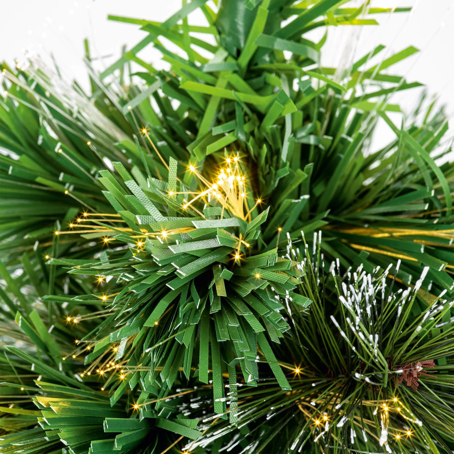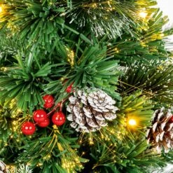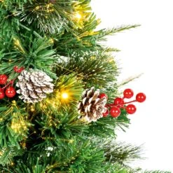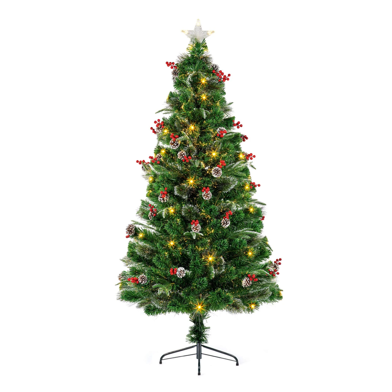Effortlessly put up your Christmas tree with this 6ft Vancouver Fibre Optic Tree with Pinecones and Berries. Featuring 220 tips with beautiful pops of red berries and brown pinecones against the luscious green coloured tree, this generous full bodied design tree has 70 integrated LEDs adorn on the branches of this charming tree. This tree is perfect for those wanting a realistic look in their home without the usual maintenance, with a green metal stand, the assembly of the tree is fuss free.