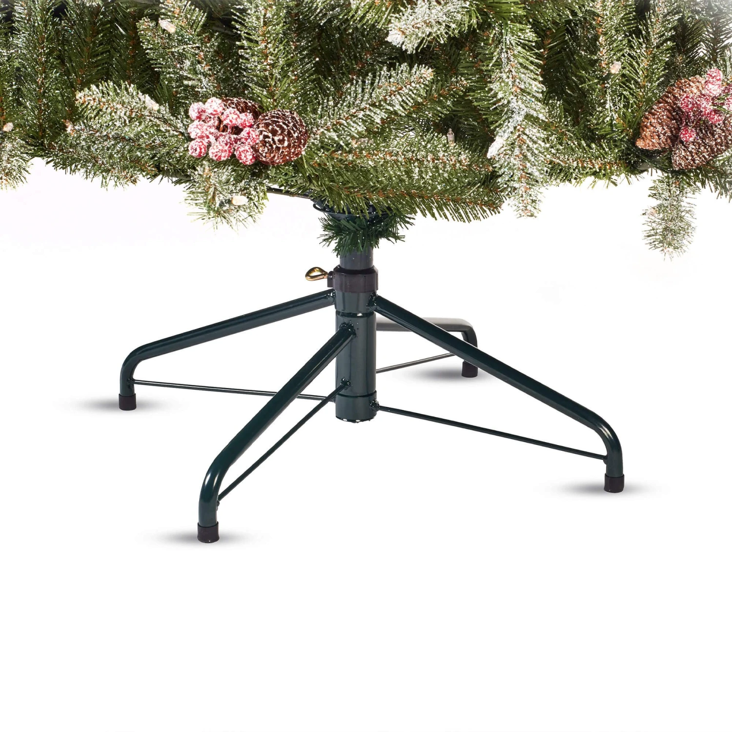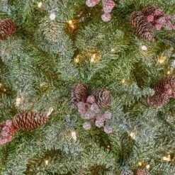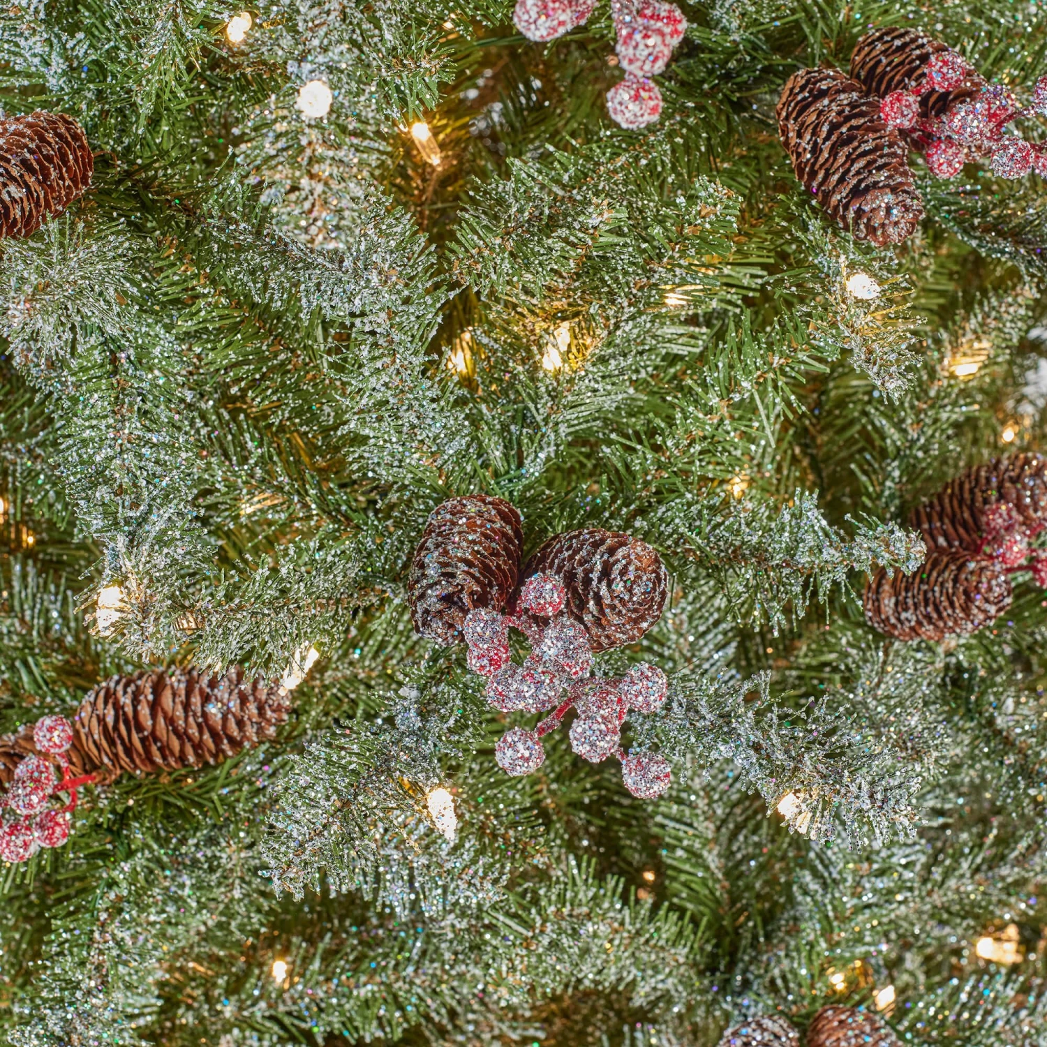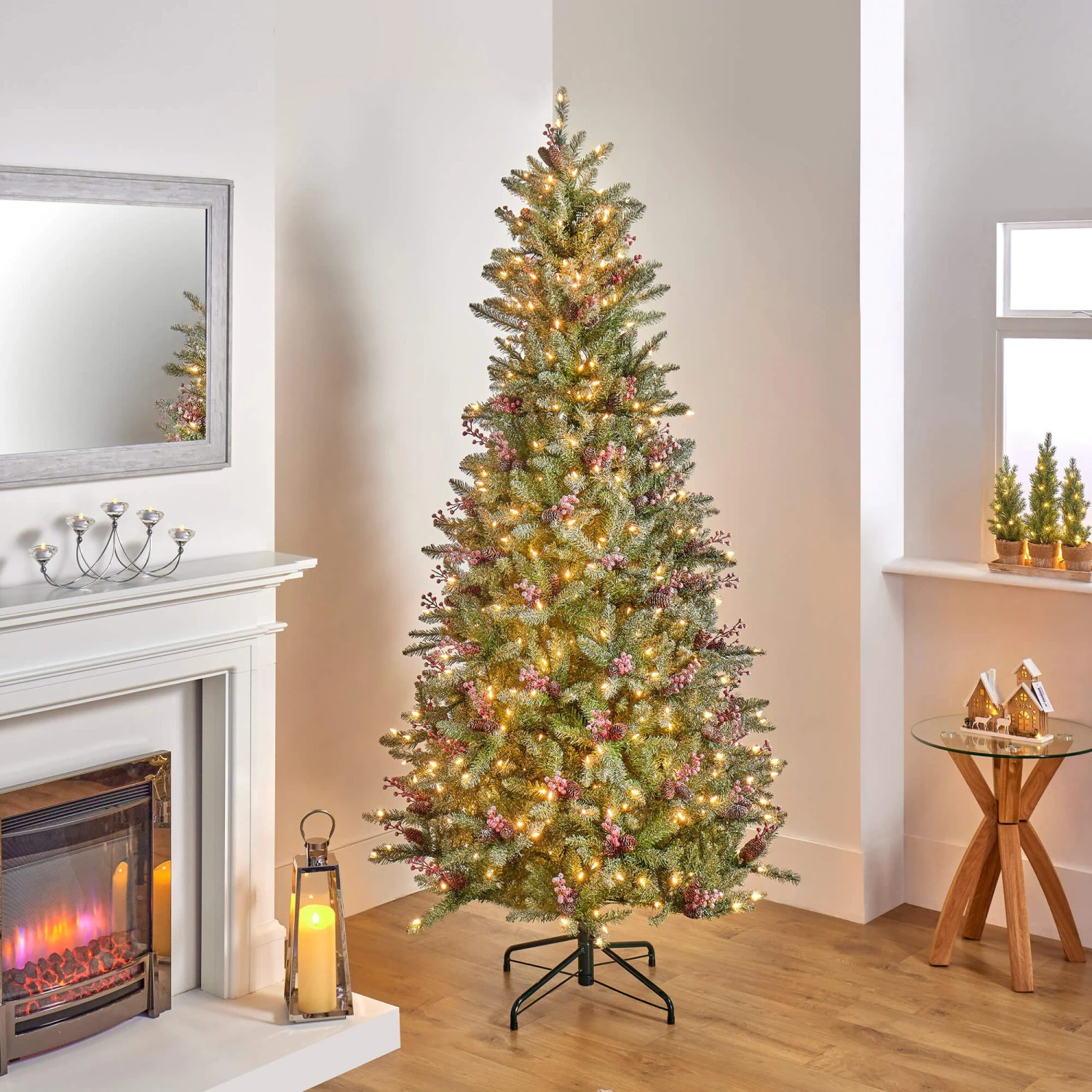 Experience the magic of a snowy Christmas with the 7ft Frosted Dunhill Fir Christmas Tree, a stunning centrepiece standing at an impressive 2.2m tall with approximately 1600 tips for a full and realistic appearance. This Artificial Christmas tree is adorned with charming sprigs of frosted berries and natural-looking pinecones, all nestled amongst the foliage, while a subtle sprinkle of snow on the tips create a serene, wintery feel. With a total of 500 individual warm white evenly distributed across the branches, this tree provides a soft, inviting glow.