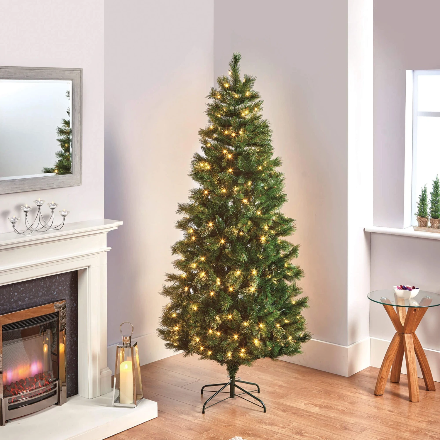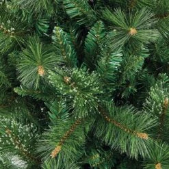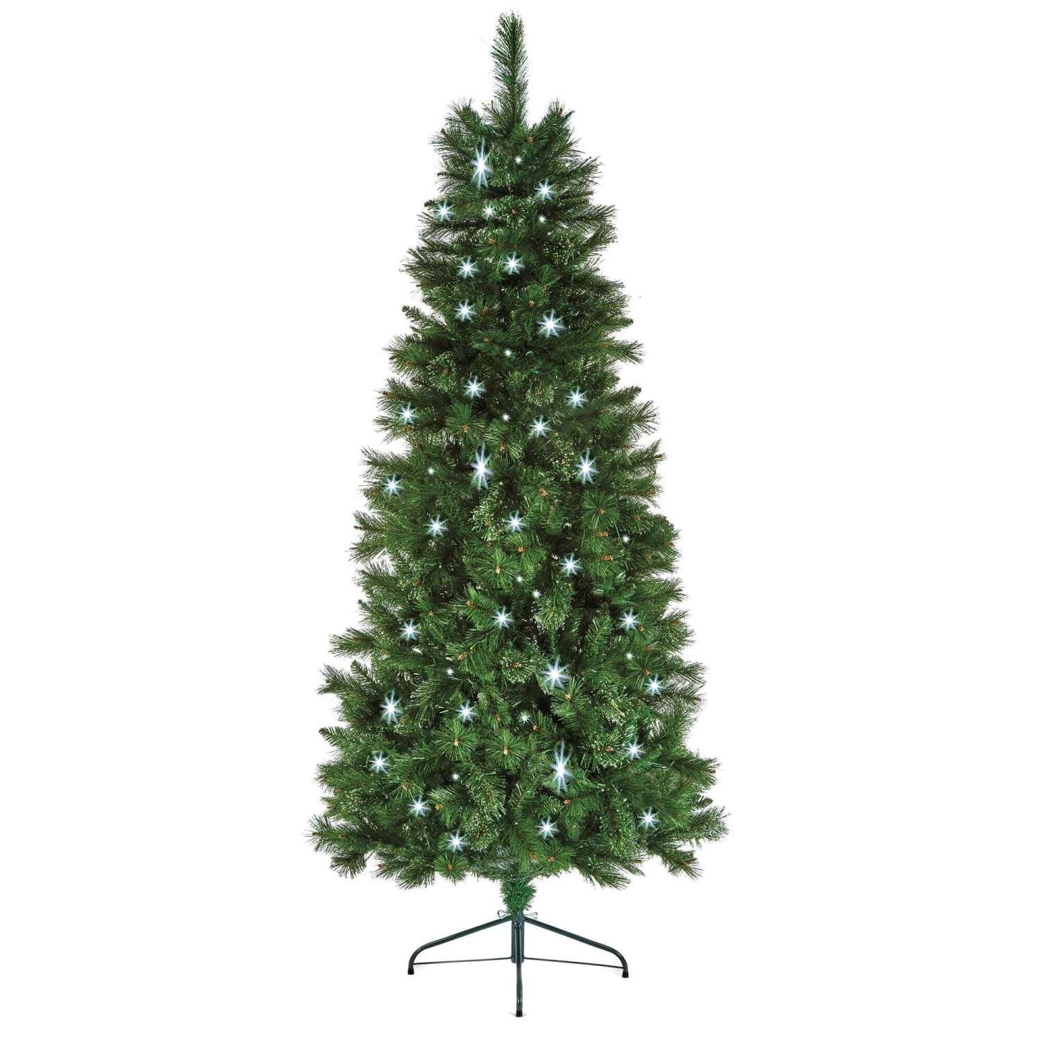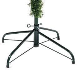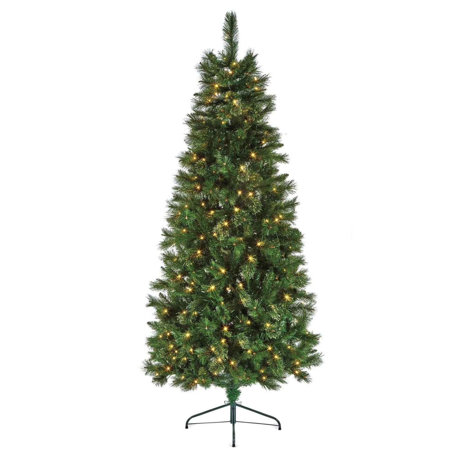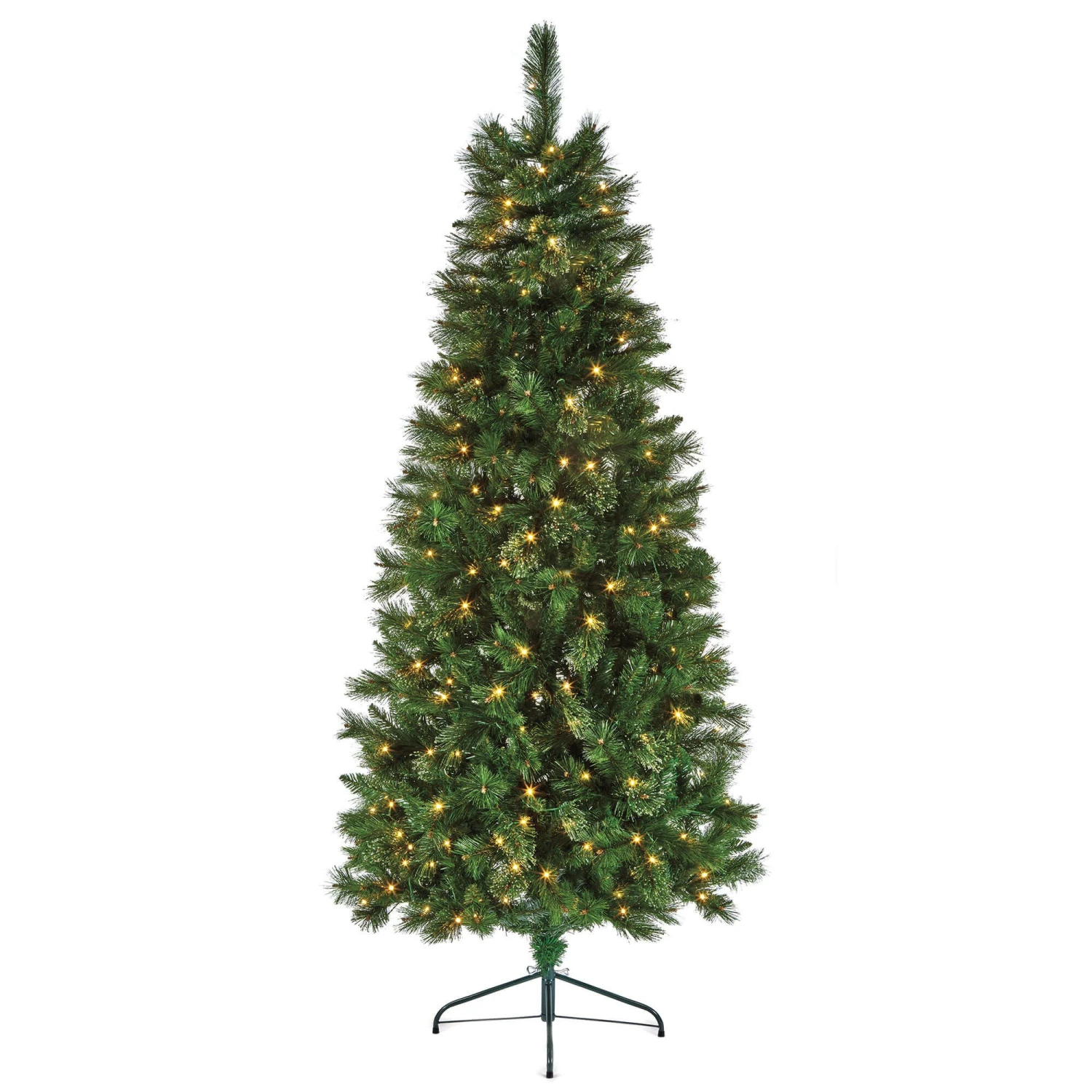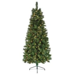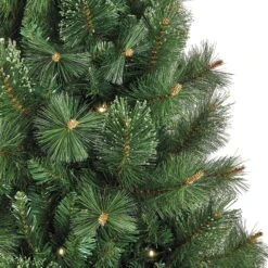 Standing at a majestic eight feet tall, this slender artificial tree is perfect for adding grand elegance to your home with ample ceiling height, without overwhelming your living space. It boasts a generous 1022 tips on hinged branches, ensuring a full yet sleek profile that is easy to assemble. The tree comes pre-lit with 340 low-voltage individual lights, offering effortless illumination.