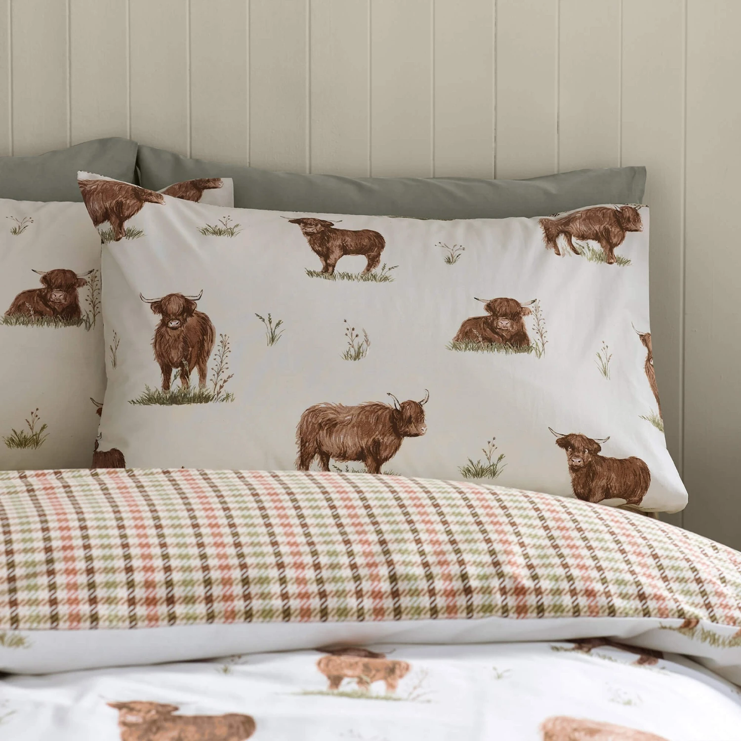 Bring some rustic charm to your bedroom with the Angus Highland Cow Bedding Collection from Catherine Lansfield. This cosy bedding collection features a delightful repeat pattern of highland cows in a variety of poses, adding a touch of countryside character to your space.