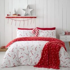 Bring some festive cheer into your bedroom this season with the Catherine Lansfield Christmas Candy Cane White Single Duvet Set. Featuring a playful candy cane design in classic red and white, this bedding set is the perfect way to capture the magic of Christmas. Crafted from an easy care polycotton blend, this duvet set combines soft comfort with practical everyday use, making it ideal for cosy winter nights. The set is also fully reversible, offering a bold red alternative on the reverse side, so you can switch up the look whenever you fancy.