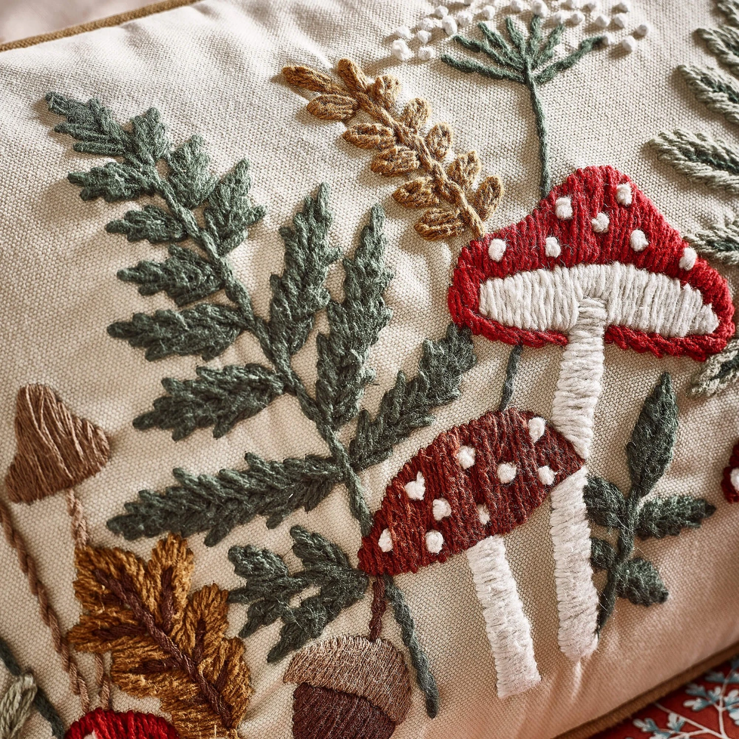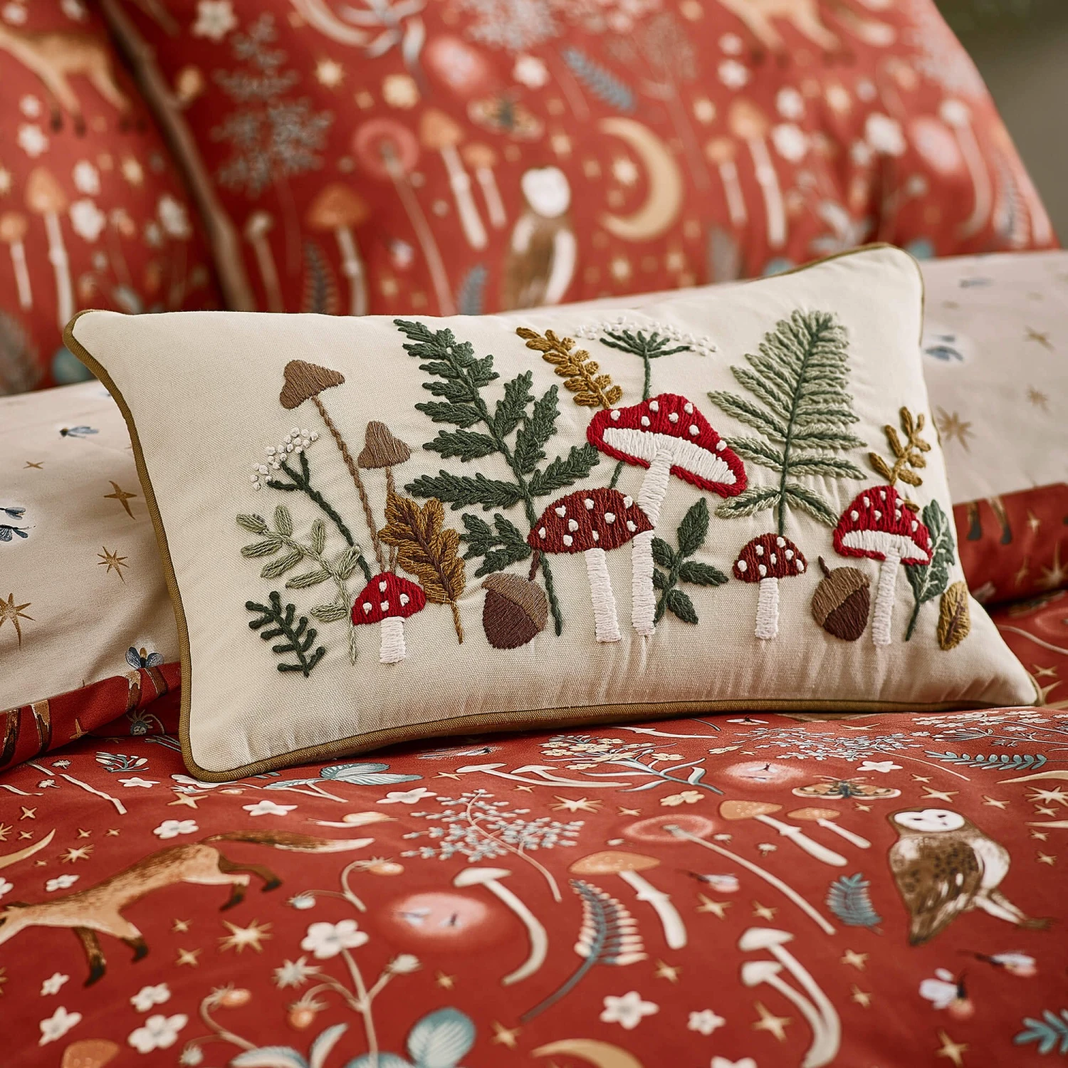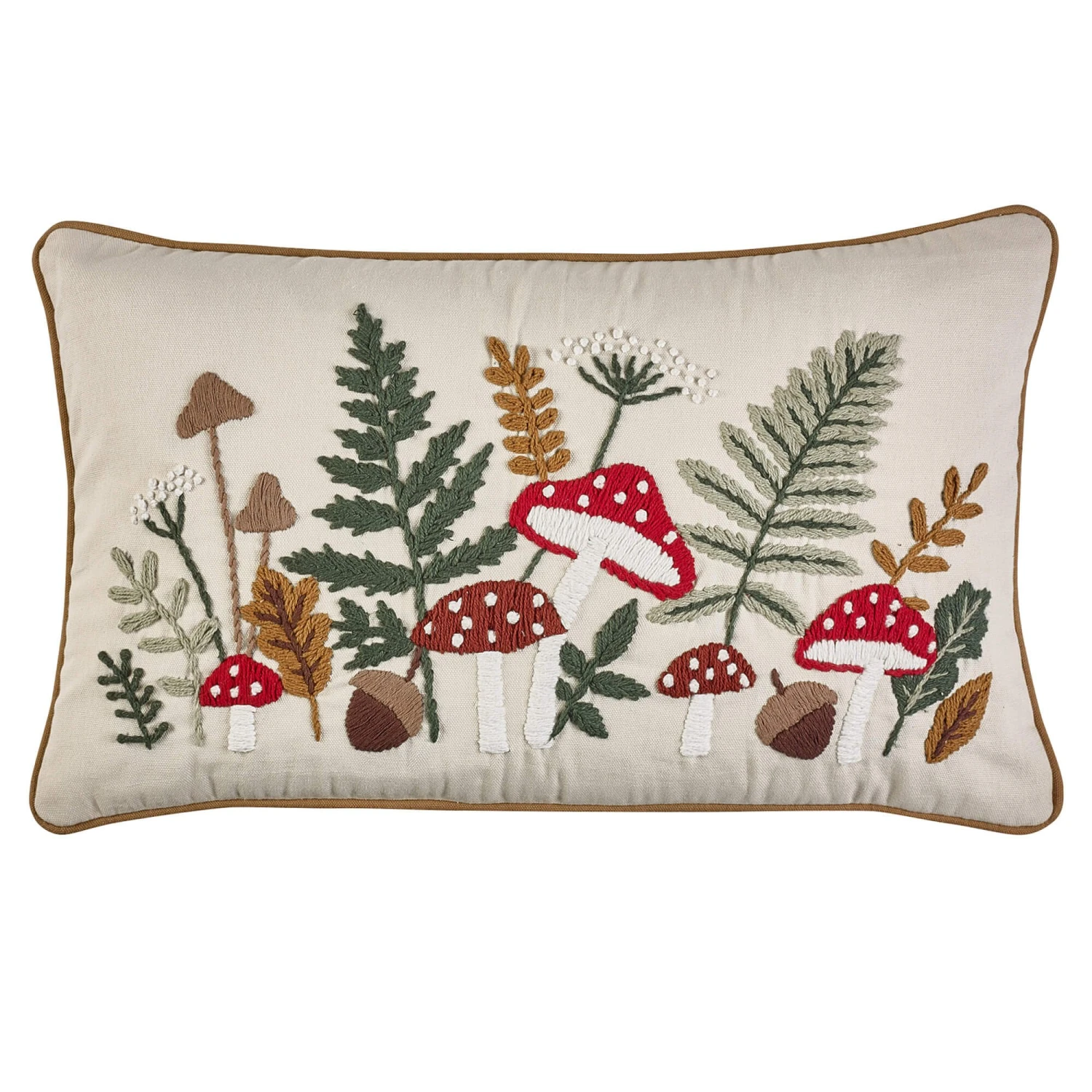 Bring a touch of whimsical charm to your home with the Catherine Lansfield Embroidery Woodland Cushion. Beautifully crafted with exquisite detailing, this decorative cushion features a delightful woodland inspired design, with intricately embroidered toadstools, ferns and foliage in rich autumnal tones. Perfect for adding a cosy, nature inspired accent to your bedroom or living space, the soft cream background provides a neutral base that allows the colourful embroidery to truly shine. Finished with piped edging for a refined look.