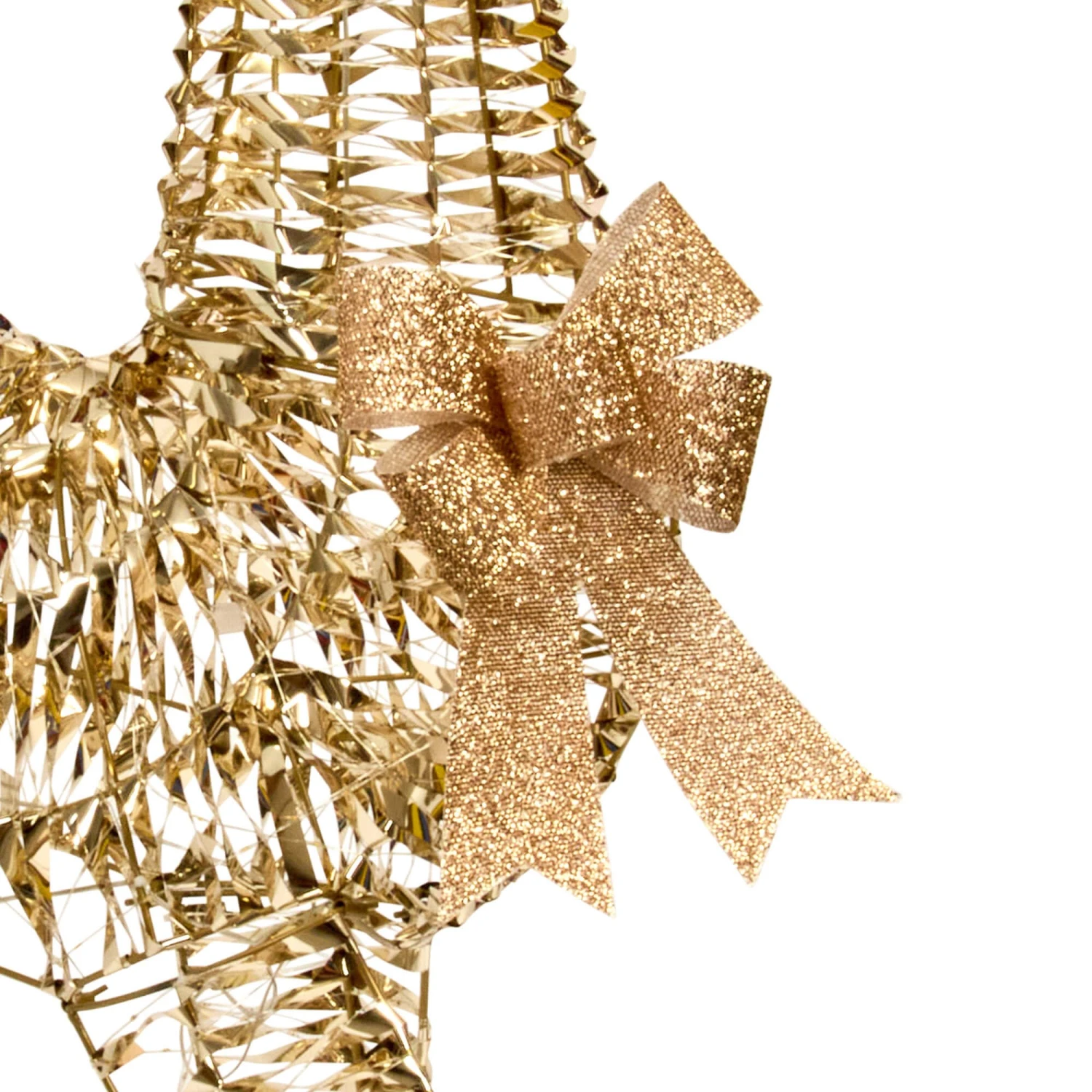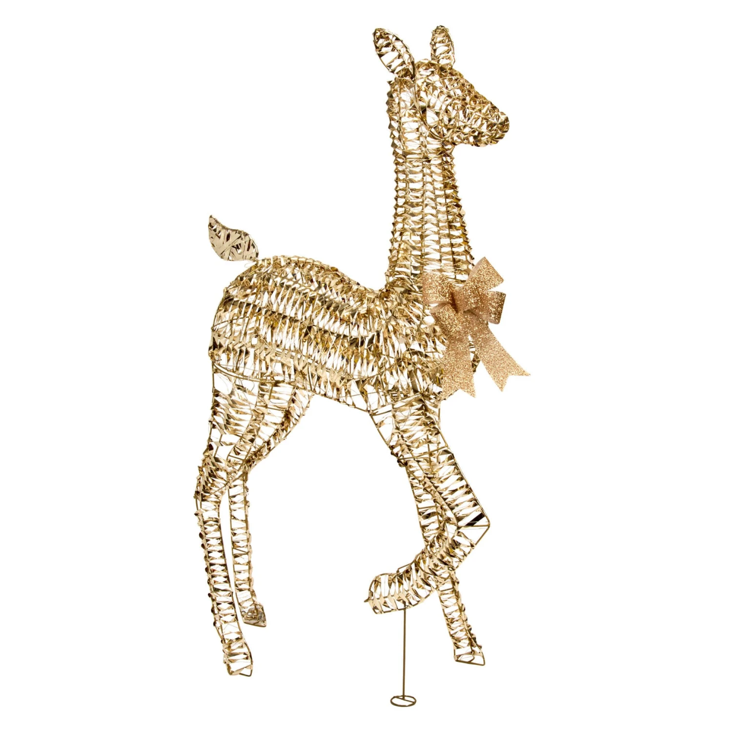 This impressive, free-standing Christmas decoration features a sturdy metal frame intricately covered in individual strands of twisted plastic, giving it a luxurious, textural golden finish. When illuminated by the integrated, energy-efficient warm white LEDs, the doe shimmers beautifully, creating a magical glow perfect for the holiday season. The design is complemented by a charming decorative golden bow adorned with sparkles, adding a delightful detail to this large outdoor Christmas figure.