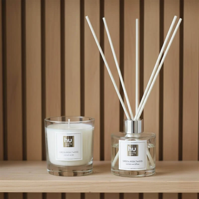 Introducing the HU Home Fragrance Collection, a bespoke range of candles and diffusers with a modern and contemporary feel. Complement your mood and transform your home with an aromatic blend of citrus, rosemary, lavender, thyme and geranium on a base of sandalwood, musk amber, patchouli and cedar. This beautifully scented Green Irish Tweed diffuser and candle bundle is proudly made in the UK and features a stylish and minimalist design that will brighten your space and will sit back with a wide range of interior décor themes.