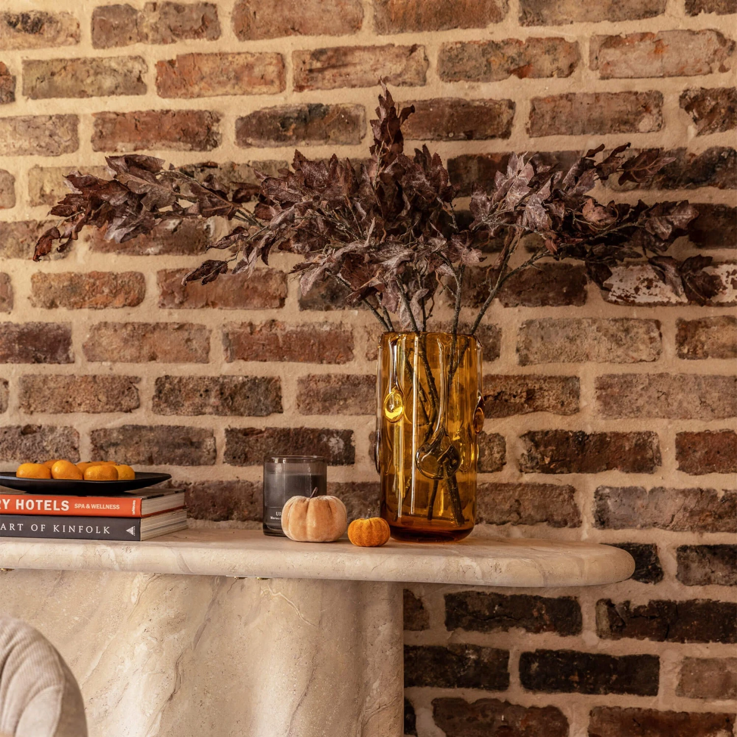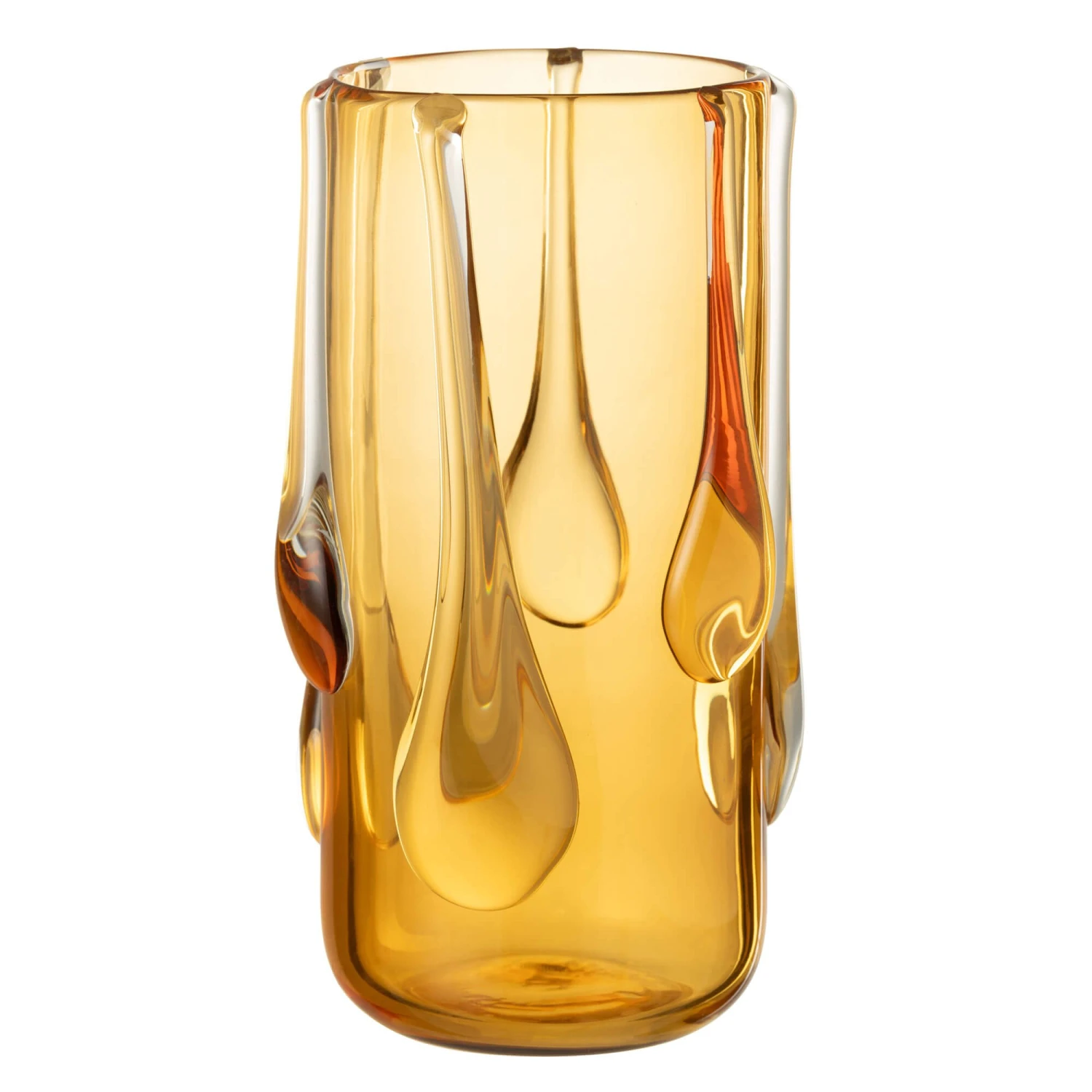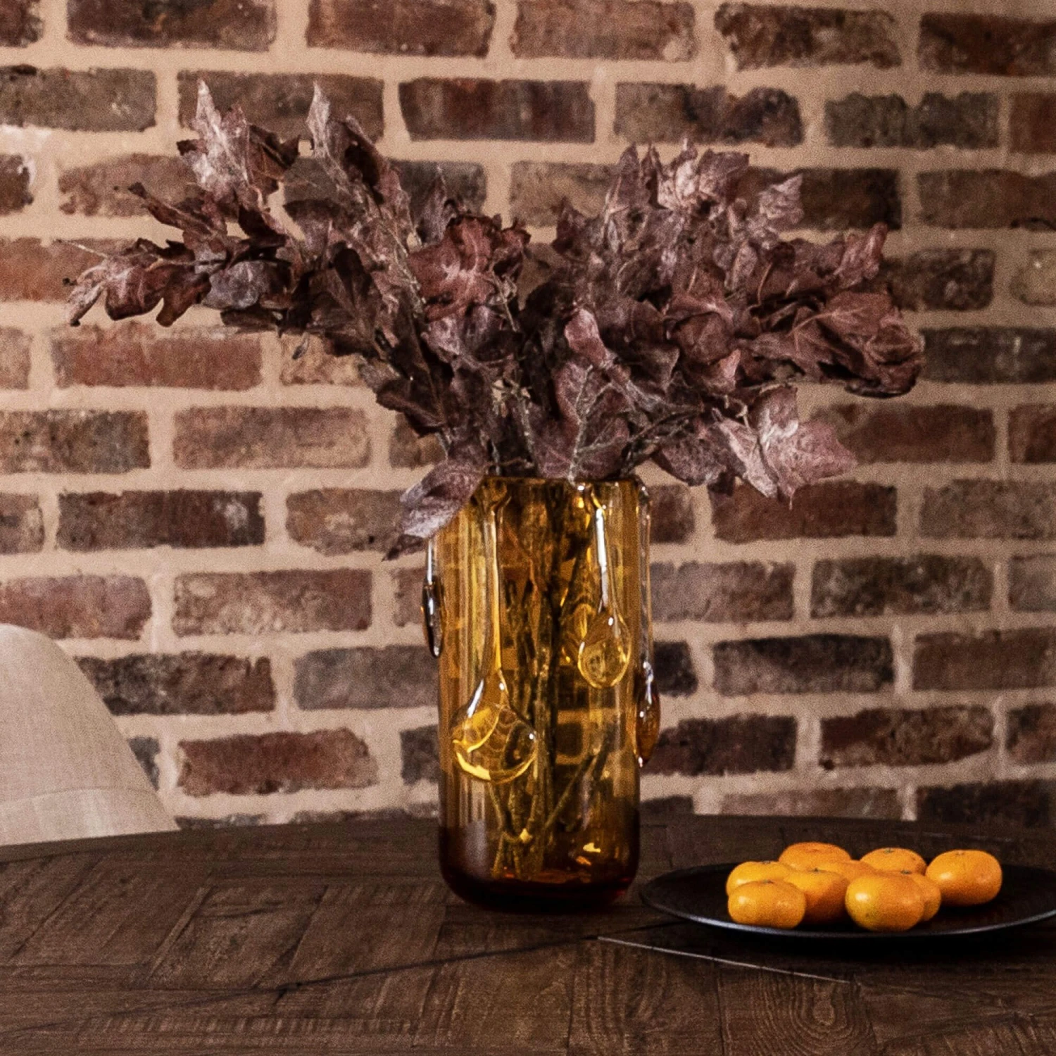 The Large Amber Drippy Glass Vase is a beautifully crafted piece designed to add a touch of artistry and elegance to your home. Made from clear glass infused with a vibrant amber hue, this vase stands 33cm tall and features a gently curved, cylindrical silhouette. Its most captivating detail is the series of decorative droplets that flow organically down the outside, each varying in length and style to create a unique, textured finish. These accents catch and reflect the light, enhancing the vase’s visual appeal and making it a standout feature on any shelf or table.