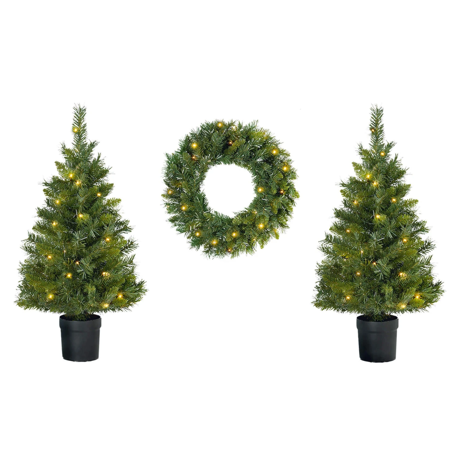 Complete the look of our front door with this wealth and 2 small tree set, pre-lit for convenience and ease when outdoors. The wreath has a 50cm width with 20 LEDs. the Trees are 90cm tall with 35 LEDs per tree, complete with a timer function.
