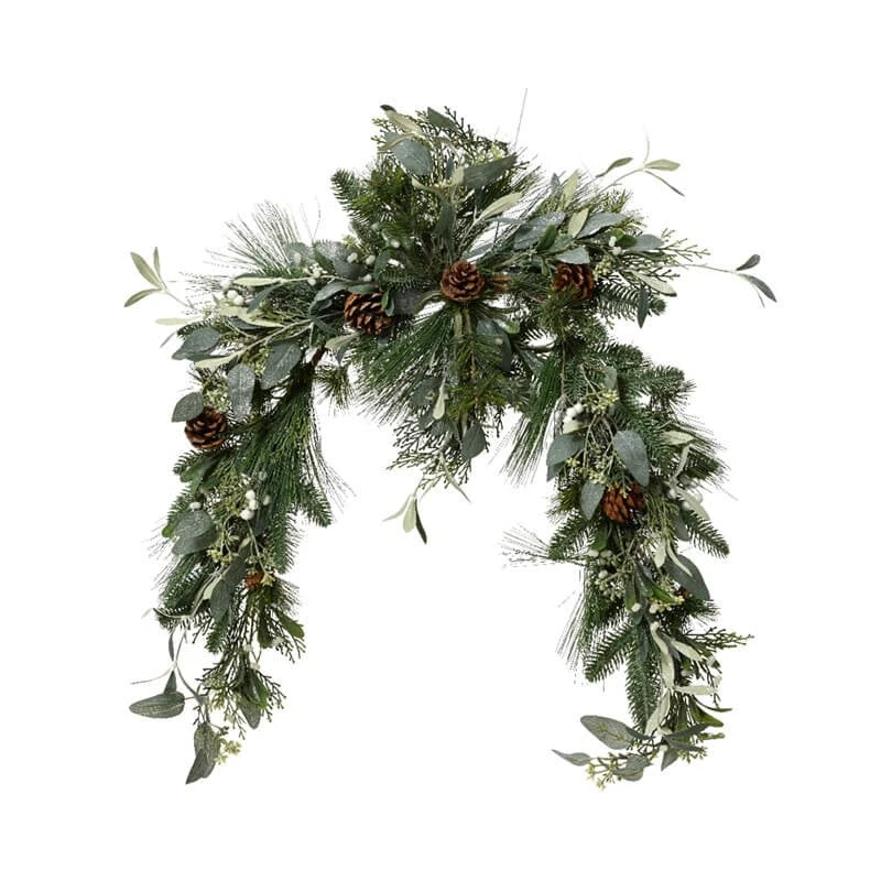 Perfect for adding a touch of festive elegance to your home décor, this beautiful garland features a delightful blend of realistic looking eucalyptus leaves and natural looking pinecones, adding a warm and inviting look. The subtle glittery finish on some of the leaf tips adds a magical sparkle, catching the light and enhancing its festive appeal. With its textured feel and authentic appearance, this artificial Christmas garland is a versatile decoration, bringing the beauty of the outdoors inside without the fuss of real foliage.