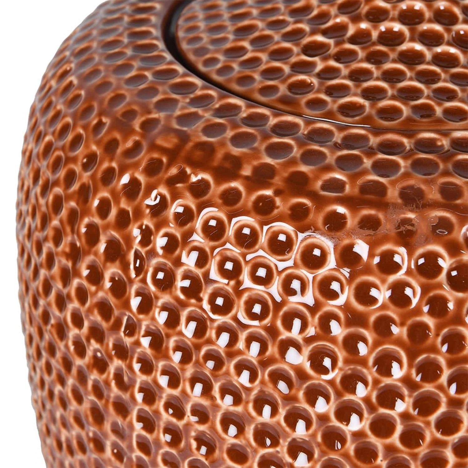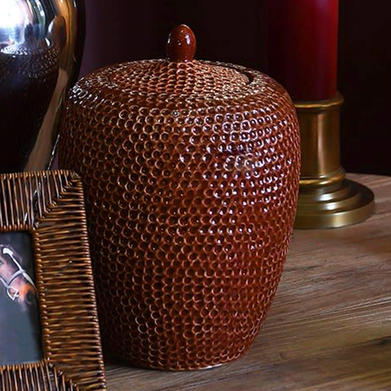 This striking mosaic style stoneware vase style jar with lid has been finished with a beautiful sheen high gloss finish that reflects light in your desired space. The textured finish in warm red and orange mixed tones create the most wonderful Autumnal effect for your home for that cosy feeling at home.